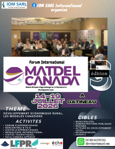 La MATDEL, Mission Africaine d’Apprentissage sur le Tourisme et le Développement Local est un évènement annuel organisé sur le territoire canadien . La MATDEL rassemble les maires et acteurs du développement local publics et privés en provenance des pays africains et ceux du Canada dans une municipalité canadienne choisie par le cabinet IOM SARL Int, en vue des échanges sur le modèle canadien du tourisme et du développement local.